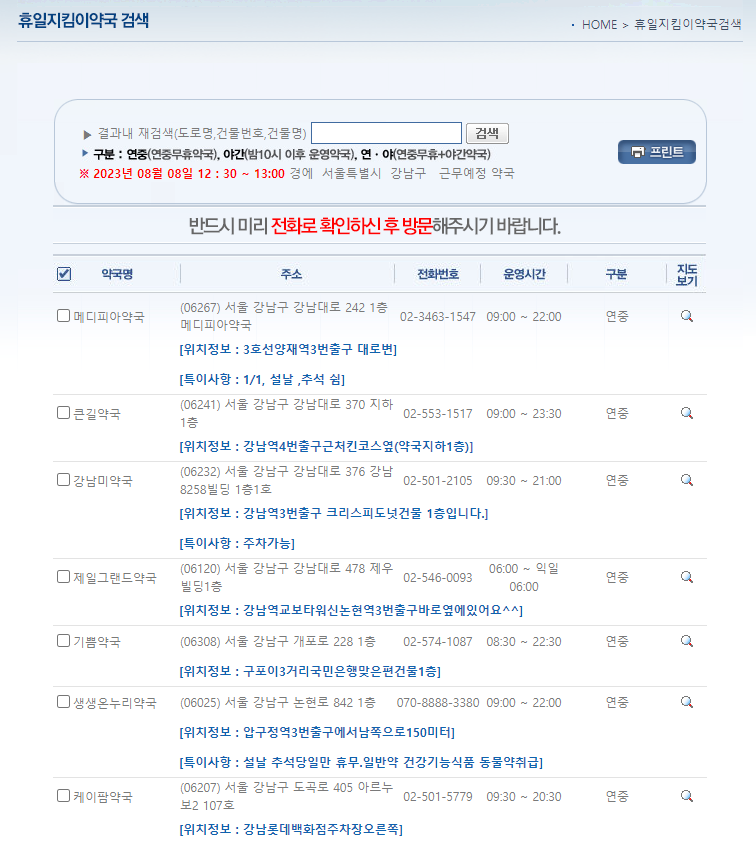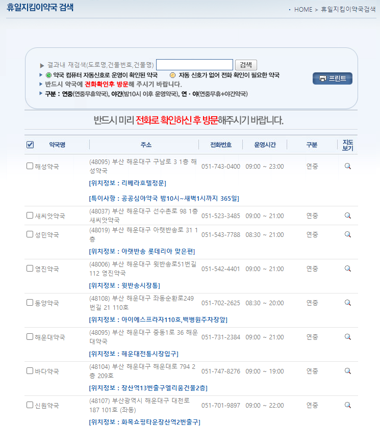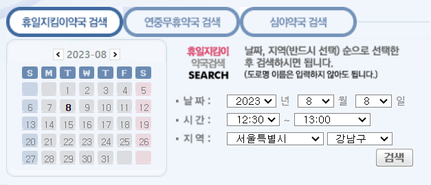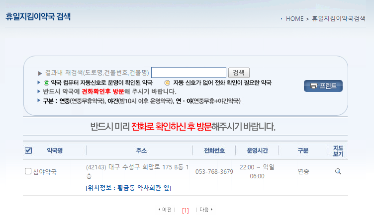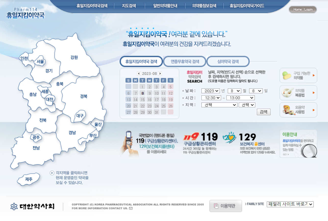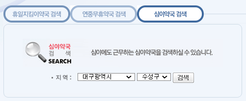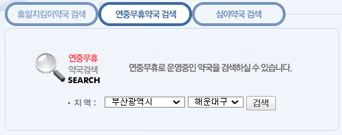 이 사이트에서는 휴일지킴이약국, 연중무휴약국, 심야약국에 대해서 검색하실 수 있습니다.
